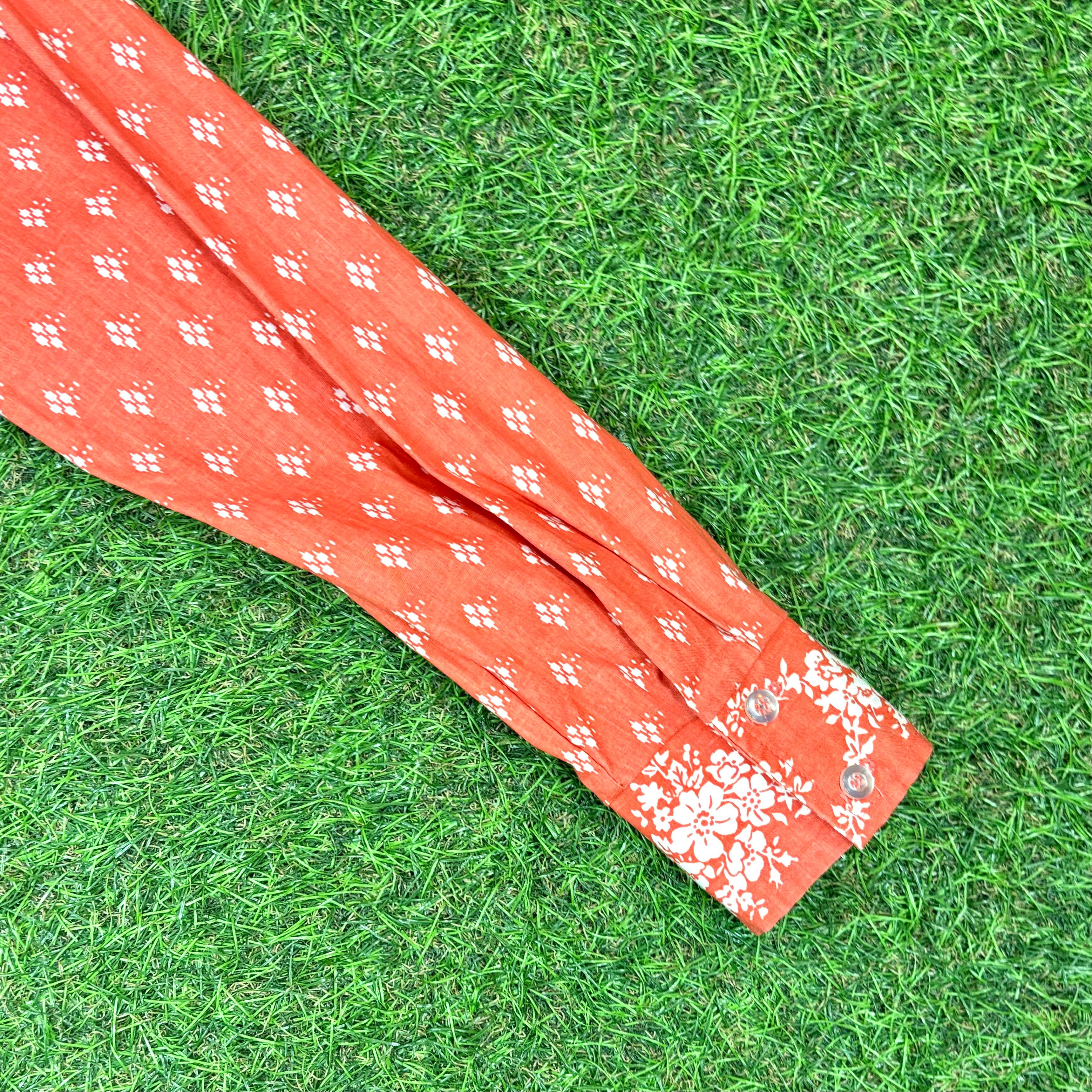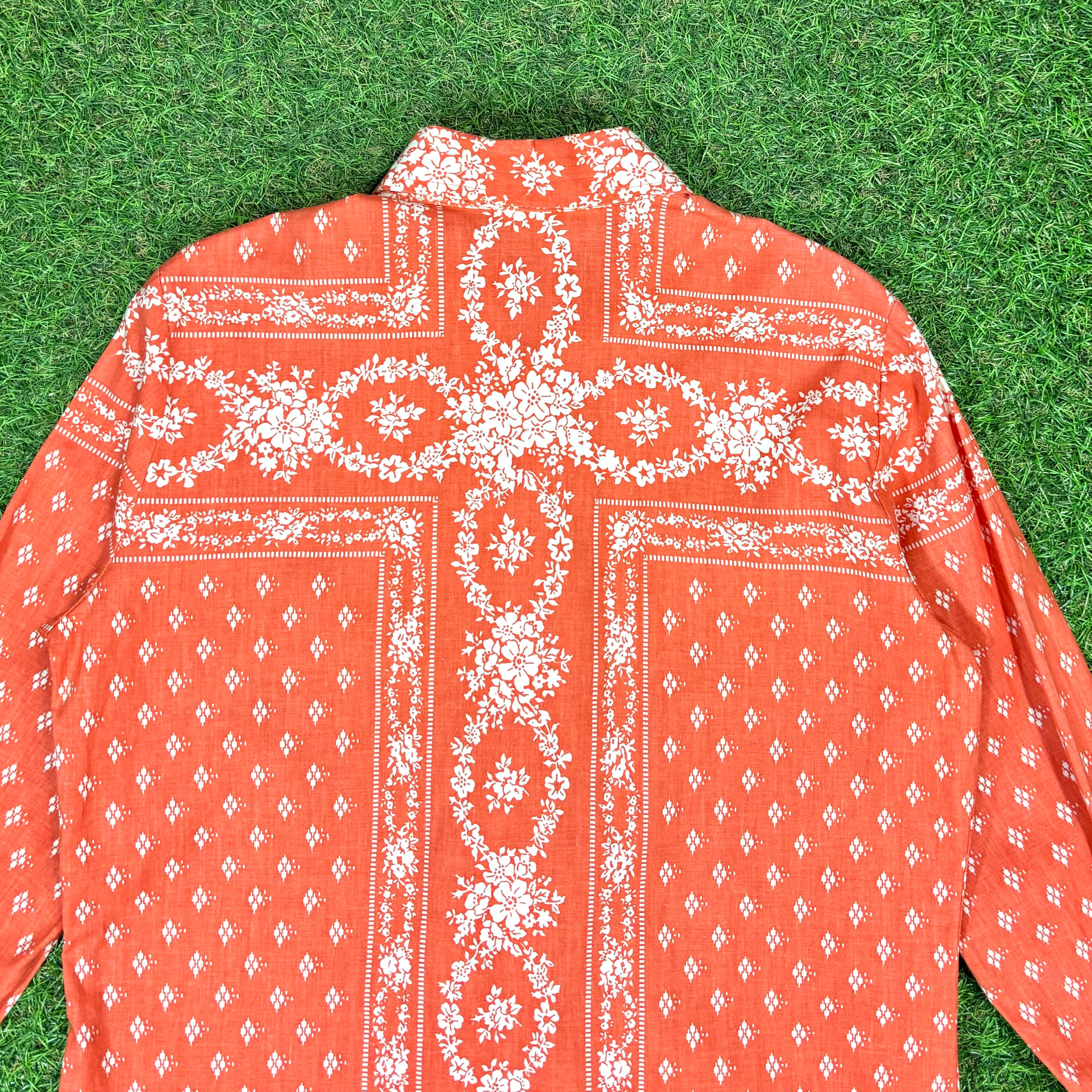 【Lady's】 70s ボヘミアン 総柄 シャツ / Made In USA 古着 ヒッピー エスニック 70年代 レディース オレンジ 柄シャツ ペイズリー