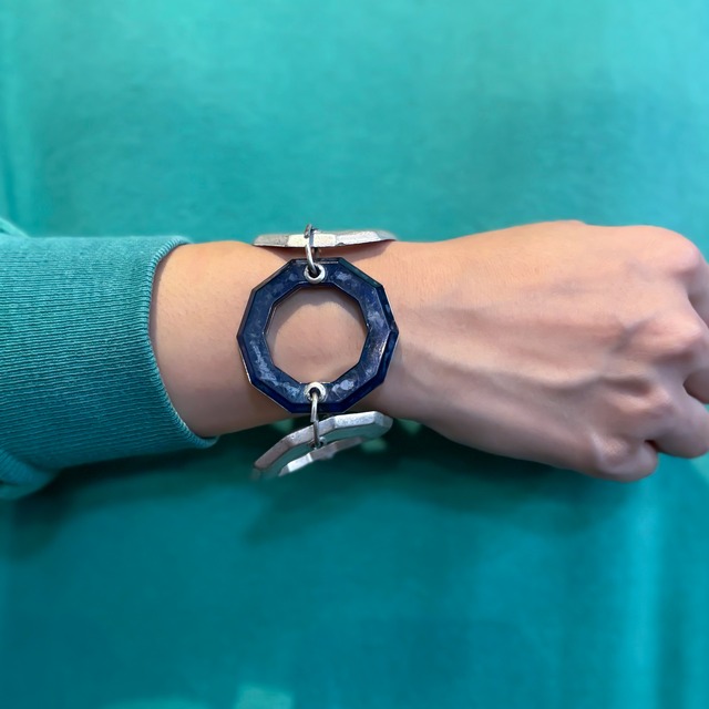 ブラックとシルバーのパーツを組み合わせた、個性的なデザインブレスレットです。 モチーフが連なる構築的なフォルムで、モダンな印象を与えながらもヴィンテージらしい質感が魅力。軽やかなつけ心地ながら、しっかりと存在感のあるデザインです。ユニセックスで使える、スタイルの主役になるアクセサリーです。 【着こなし提案】 モノトーンコーデに取り入れて、デザイン性のあるアクセントとして。Tシャツやシャツスタイルにも自然に馴染みつつ、アートピースのような雰囲気をプラスしてくれます。シルバーリングやネックレスとの組み合わせもおすすめです。 ご質問は、画面下の「ショップに質問する」ボタンよりどうぞ◎ ---------- <SIZE> 本体の長さ 約20cm <CONDITION> 擦れで色落ち感あり 着用に支障のあるダメージはございません。 【その他のアクセサリーをチェック】 https://pcefulvalley.base.ec/categories/6593675 ---------- PEACEFUL VALLEY.のアイテムは、すべて一点もの。 気になるアイテムはどうぞお早めに! ご不明点などあればお気軽にお問い合わせください 【配送方法について】 こちらの商品はレターパックライト(全国一律430円)でお届けいたします。 ※3着以上ご購入の方は、商品オプションの「3着以上購入の方はこちら」をご選択ください。 ---------- 【ショップフォローのご案内】 PEACEFUL VALLEY.では、Pay IDアプリ内でショップをフォローいただくと、新作情報やお得なキャンペーンをいち早くご覧いただけます。 ぜひこちらからフォローしてご利用ください! ▶︎ フォローはこちらから https://thebase.com/to_app?s=shop&shop_id=pcefulvalley-base-ec&follow=true ---------- ※USED商品ですので小さなシミほつれ、擦れ、使用感などの記載しきれない所もございますが、ご理解の上ご購入下さい。 ※実際の色合いとは異なって見える場合がございますが、ご了承ください。 ※サイズは丁寧に採寸しておりますが、サイジングの仕方による多少の誤差が出る場合がございます。 ※掲載商品は店頭での販売も行っている為、注文が重複してお買い上げができない場合がございます。 ※購入後の返品交換は致しかねます。ご了承ください。 ※商品等の質問はトップページのコンタクト、またはインスタグラムのDMまでご気軽にお問い合わせください。